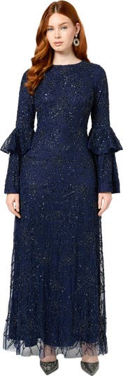 Modest Embellished Sequin Beaded Maxi Dress With Frilled Sleeves