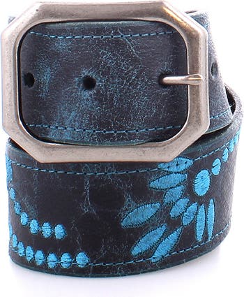 Mohawk is a women's distressed leather belt featuring intricately embroidered details with tonal stitching. The floral design will surely get noticed, along with the uniquely shaped metal buckle. Enjoy the Mohawk belt through belt loops or around your waist of your favorite maxi dress.