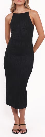 Sleek cutaway shoulders frame this figure-sculpting midi textured with swirling tonal stripes and finished with an airy back slit for easy movement.