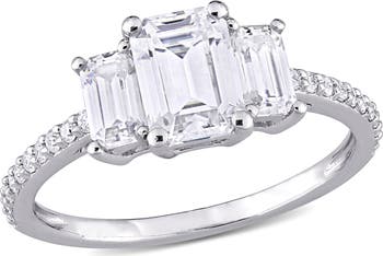 Present your lifelong promise with the striking symmetry and magnificent fire of this three-stone engagement ring. Crafted in radiant 10k white gold, the ring showcases a substantial center stone flanked by two equally brilliant side stones. The created moissanite, totaling one and three-quarters carats diamond equivalent weight, are cut in a sophisticated octagon shape, offering exceptional brilliance and a modern, geometric appeal. This ring is a powerful symbol of your past, present, and future, delivered with stunning luxury.
