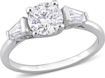 This stunning created moissanite three-stone engagement ring is crafted in lustrous sterling silver, this glitzy ring features one round-cut, prong-set, white-created moissanite (6.5x6.5mm) gemstone sandwiched between two taper baguette-cut, channel-set white created moissanite (3x2mm) gemstones. Enhanced with a polished finish, this splendid ring epitomizes femininity. Pair this ring with any ensemble for a polished look.