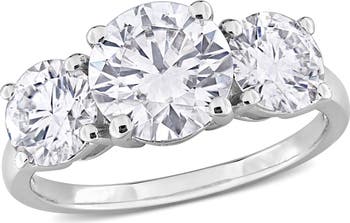 Present your enduring promise with the classic elegance and spectacular fire of this three-stone engagement ring. Crafted in luminous sterling silver, the ring features three brilliant created moissanite stones, symbolizing your past, present, and future together. With a substantial three and one-quarter carats diamond equivalent weight, this piece delivers breathtaking brilliance and light. This design is a magnificent and timeless declaration of everlasting love.
