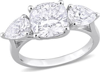 Commemorate your journey with the magnificent blend of shapes and spectacular brilliance of this three-stone ring. Crafted in luminous sterling silver, the piece features a brilliant cushion-cut created moissanite center stone, perfectly flanked by two elegant pear-shaped created moissanite side stones. With a substantial four and five-eighths carats diamond equivalent weight, this ring delivers unparalleled fire and light, symbolizing your beautiful past, present, and future together. This design offers a unique and luxurious statement of enduring commitment.