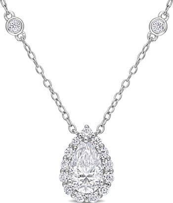 Elevate your elegance with this dazzling halo necklace, featuring created moissanite stones set in sterling silver. The radiant sparkle of the stones surrounded by a sleek halo creates a timeless, luxurious look perfect for any occasion. A true showstopper.