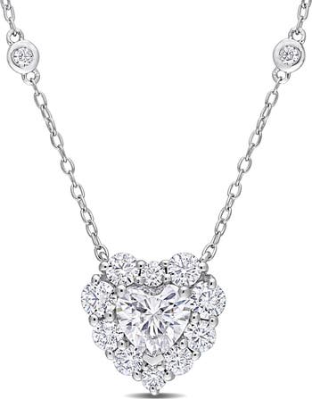 This heart moissanite halo station necklace is crafted in lustrous sterling silver. This elegant necklace features a heart-cut, prong-set created white moissanite gemstone at its center surrounded by a halo of round-cut created white moissanite gemstones along with eight round-cut, bezel-set created moissanite gemstones in a classic by-the yard station necklace design. Enhanced with a high polish finish, this magnificent gemstone necklace is hung on an 18-inch cable chain and secured with a lobster clasp. Instantly add a touch of elegance and sophistication to your look with this stunning necklace.