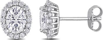 Add a touch of elegance to your look with these oval halo stud earrings featuring 2 1/3 carats of dazzling DEW created moissanite, set in sterling silver. The stunning halo design enhances the brilliance of the moissanite, creating a captivating sparkle from every angle. Perfect for any occasion, these earrings offer a sophisticated yet timeless charm that effortlessly elevates your style. Whether you're dressing up for a special event or adding a bit of glamour to your daily wear, these earrings are sure to make a statement.