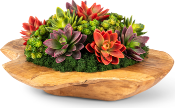 Natural and sculptural, the Mojave Wooden Bowl Succulent Arrangement features a stunning blend of lifelike succulents nestled within a large, intricately curved wooden bowl. The rich texture of the wood complements the vibrant greenery, creating a harmonious balance of organic beauty and refined design. This arrangement adds a rustic yet sophisticated touch to any space, perfect for those who appreciate both nature and craftsmanship. A lasting luxury, timeless and unrivaled.