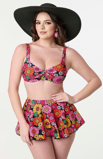This retro swim top from Unique Vintage features molded cups that are secured with adjustable straps and accented with a charming bow. Complete with hook back!