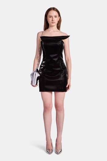 As seen on the NYFW runway. A sculptural mini dress crafted in high-shine molded vinyl. This statement piece features a sleek, body-hugging silhouette and structured design for a bold, modern look. Fully lined for comfort, with a hidden back zipper for a smooth finish. Ideal for fashion-forward occasions, from special events to standout evenings.