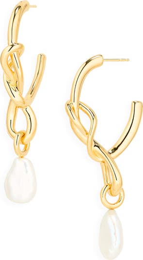 A knotty design adds to the sculptural silhouette of these gleaming hoop earrings finished with lustrous baroque pearl drops.
