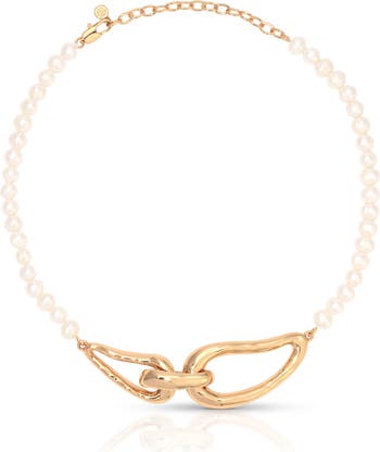Freshwater pearls and molten links bring an organic glimmer to this statement-making necklace.