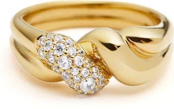 A classic stack ring done with a twist, this doubled ring features an overlapping silhouette highlighted by pavé cubic zirconia and polished 18-karat-gold plating.