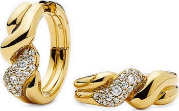 Warm liquid metal and icy pavé intensify the shine of these twisted hoop earrings that elevate both day and evening looks.