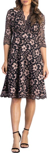 - 3/4 length sleeves, two-tone floral lace, A-line silhouette, and fully lined on bodice and skirt.