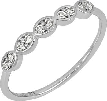 Pairs of prong-set diamonds twinkle atop a slender stackable ring crafted from 18-karat white gold.