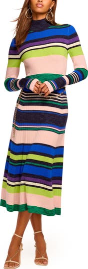 Soft ribbing creates a figure-hugging shape in this chic sweater-dress patterned in variegated stripes and knit from ultrasoft merino wool.