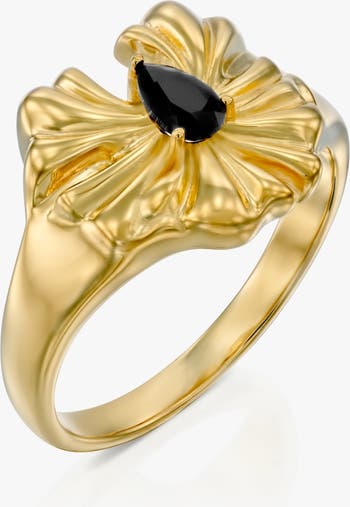 A striking signet ring featuring Sereia’s signature flower design, inlaid with a pear-shaped natural black agate stone. With its bold yet elegant presence, this ring blends modern artistry with lasting sophistication