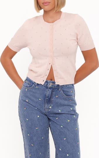 Airy pointelle stitching brings lightweight charm to this short-sleeve button-up knit from lightweight cotton-blend yarns.