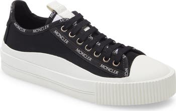 Moncler's logo repeats along the trim of a cotton canvas sneaker crafted with a sloping midsole that resembles a snowy mountaintop. A thick, foam-cushioned tongue creates a comfortable fit.