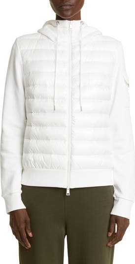 Moncler showcases their aptitude for sleek, athletic silhouettes with this mixed-media puffer jacket that's designed with gleaming aglets and a roomy knit hood.