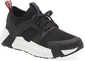A stretchy neoprene upper and cagelike overlay provide a secure fit for a sporty sneaker grounded by a chunky wedge sole with iconic logo tread. A tricolor stripe pull tab pays homage to the colors of the French flag and Moncler's heritage.