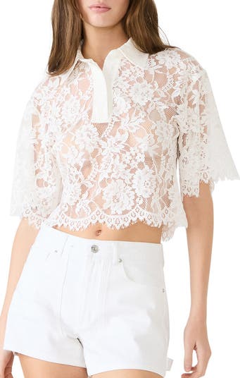 Floral lace and eyelash fringe trim add sweet details to a sheer layering top with further styled with a crisp spread collar, short sleeves and cropped hem.