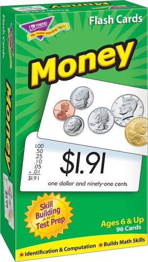 Content-rich money cards do their job, teaching students new skills in a fun way. This educational aid teaches money using U.S. coins and bills from 1¢ to $20.00, numbers, and words. Photos for real-life learning. Self-checking, answers on card backs. Sturdy cards and storage box. Students will delight in mastering new skills. No-see-through cards with quick-sorting, rounded corners. 96 cards, 3" x 6".