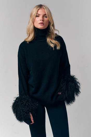 Turtleneck cashmere sweater featuring genuine removable Mongolian shearling cuffs, a versatile piece that combines timeless elegance with modern detailing.