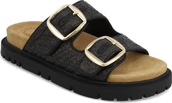 A pair of adjustable straps deliver a customized feel on a raffia slide sandal grounded by a contoured footbed and treaded platform sole.