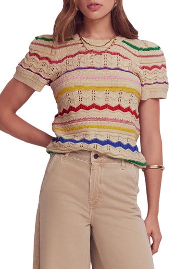 Happy-hued stripes brighten this cotton top, then dainty pointelle stitchwork adds a sweet, heirloom-like texture. Short puff sleeves frame the silhouette with a tidy, romantic finish.
