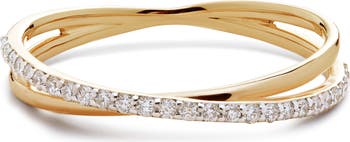 This sterling silver ring plated in 14-karat gold flaunts a delicate X-shaped silhouette glittering with a line of hand-set diamonds.