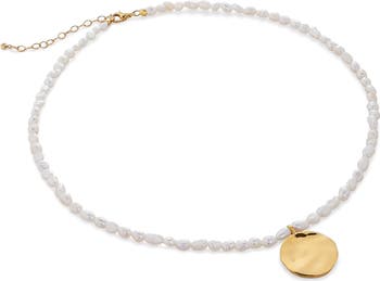 This necklace inspired by deep-sea treasures features a line of baroque keshi pearls and a hammered coin pendant.