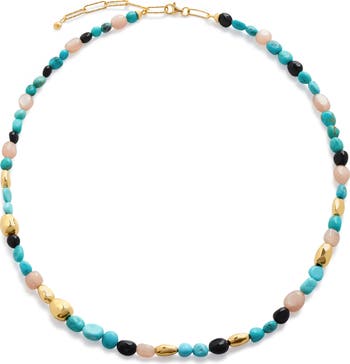 Pebble-inspired beads crafted from sterling silver and plated in 18-karat gold enhance the organic-inspired style of this necklace beaded with colorful stones.