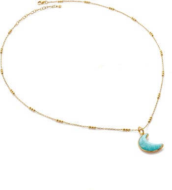 A crescent moon pendant beams with an amazonite inlay at the center of this sterling silver necklace plated with 18-karat gold and stationed with tiny beads.