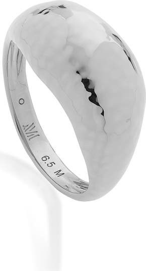 A sculptural dome ring crafted of recycled sterling silver features a molten-metal look with organic curves that catch and play with the light.