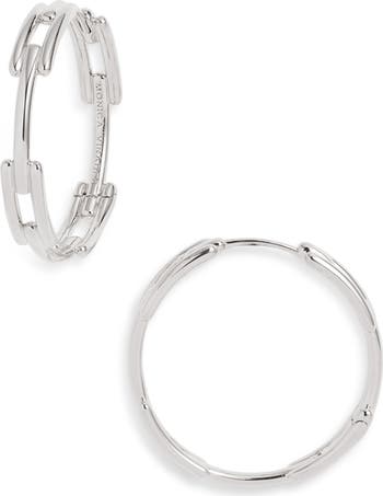 Geometric bars and open links give sleek modernity to these handcrafted hoop earrings.