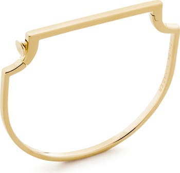 This glistening bangle is designed with a dynamic mix of geometric lines and flowing curves. The striking piece is fastened with a hardware-inspired hinge closure.