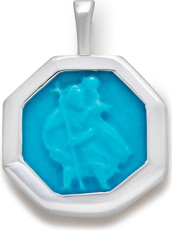 Saint Christopher, the patron saint of travelers and children, is rendered on a pendant carved from turquoise with a sterling silver frame. This dainty piece makes a thoughtful gift or an elegant addition to your favorite necklace or bracelet.