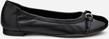 A chic cap toe accented with a buckle strap refreshes the look of a staple ballet flat designed with an elasticized topline for a stay-put fit.