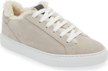 Signature monili beading tags the tongue on this elevated take on a court sneaker crafted in Italy from plush suede and genuine shearling.