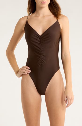Shirring lends slight dimension to this stretchy one-piece swimsuit cut in a dive-ready high-leg silhouette.