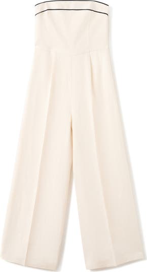 Contrast stripes highlight the strapless neckline of this effortlessly sophisticated wide-leg jumpsuit fashioned from lightweight linen.