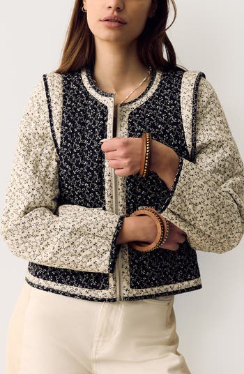 Stay on-trend in this quilted jacket styled in a boxy, slightly cropped silhouette and charmed by an allover abstract print.
