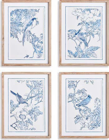 This set of four bird illustrations in soothing tones of blue is made for the traditional to transitional space. The real crisp white mats and light fir wood frames finish them off beautifully.