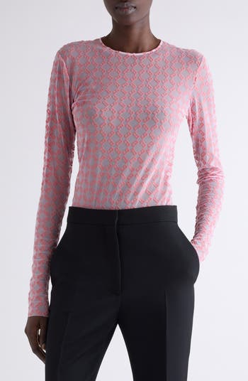 The label’s Monogram 72 pattern, a captivating reinterpretation of the iconic 4G logo, takes center stage in flocked velvet across this fitted sheer mesh top.
