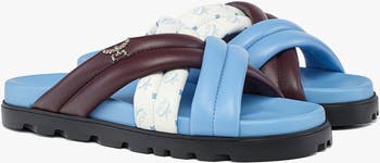 Womens Italian lambskin leather cross strap sandals with Visetos monogram print and Laurel hardware