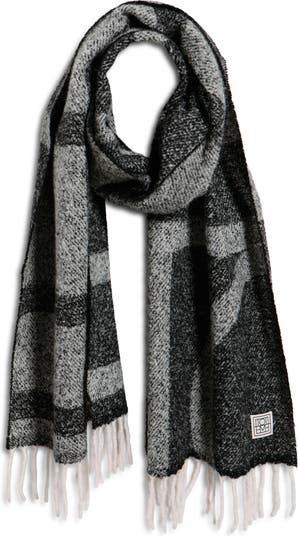 The Scandi brand's minimalist monogram takes shape in statement-scale geometries on this warm alpaca-blend bouclé scarf finished with wispy fringe.