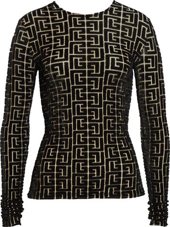 Plush burnout velvet reveals peekaboo glimpses of skin in this fitted top with a maze-like monogram pattern reflecting founder Pierre Balmain's fascination with France's labyrinthine gardens.
