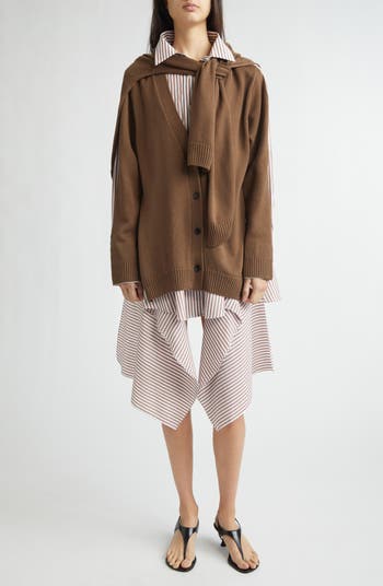 Achieve a layered look with one‑and‑done ease in this crisp cotton‑poplin shirtdress prestyled with a draped merino‑wool cardigan sporting more sleeves than strictly necessary.