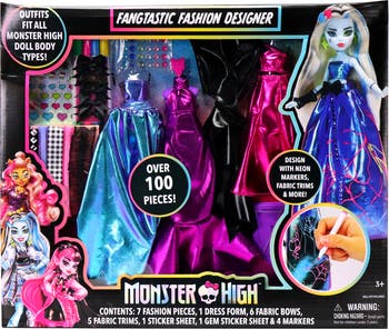 MONSTER HIGH: FANGTASTIC FASHION DESIGNER - Girls will love being their own designer for their Monster High dolls! Create your own fangtastic fashion design looks by turning plain dresses into fabulous fashions. Design with neon markers and add embellishments to create your own looks! Set includes over 100 pieces to make 6 ghoulish fashions! Durable and specifically designed for small hands. DISPLAY YOUR FASHION PIECES on the dress stand or dress your favorite Monster High dolls! Outfits fit all Monster High body types. NO SEWING REQUIRED! Use trims, embellishments and flitter stickers to turn your outfits into fabulous fashions created by you! Use the dress form to display your favorite creation. SET INCLUDES 6 fashion pieces, dress form, 2 sticker sheets, 6 fabric embellishments, 5 fabric trims gem sticker sheet & 4 neon markers. Doll accessory set - *Dolls NOT included*